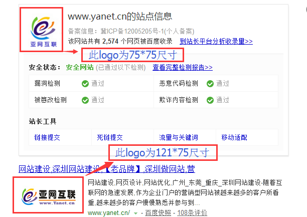 a.LOGO提交尺寸:PC/移動站可提交121*75、75*75、84*52三種尺寸的圖片。其中121*75尺寸的LOGO用于PC檢索時候展現(xiàn)在TITLE下方、75*75尺寸的LOGO用于使用SITE命令的時候展現(xiàn)、而84*52尺寸的LOGO則主要是自適應站、具有獨立移動站等網(wǎng)站在移動端展示的。