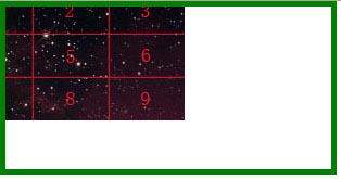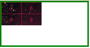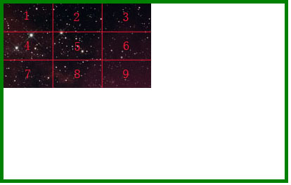 注: 本文中使用的圖片大小為 300px*120px,為了能很清晰的表達(dá)圖形的哪部分被隱藏了,按照?qǐng)D片的大小平均分成了9等份。同時(shí)背景圖片容器區(qū)域繪制出綠色邊框清晰顯示容器的范圍。