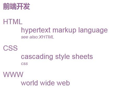 1 <!DOCTYPE html> 2 <html lang="en"> 3 <head> 4 <meta charset="UTF-8"> 5 <title>筆記</title> 6 <style> 7 body{color:#969;} 8 h1{font-size: 15px;} 9 dd+dt{ 10 margin-top: 10px; 11 } 12 dd+dd{ 13 font-style: italic; 14 font-size: 10px; 15 } 16 </style> 17 </head> 18 <body> 19 <h1>前端開發(fā)</h1> 20 <dl> 21 <dt>HTML</dt> 22 <dd>hypertext markup language</dd> 23 <dd>see also:XHTML</dd> 24 25 <dt>CSS</dt> 26 <dd>cascading style sheets</dd> 27 <dd>css</dd> 28 29 <dt>WWW</dt> 30 <dd>world wide web</dd> 31 </dl> 32 </body> 33 </html>